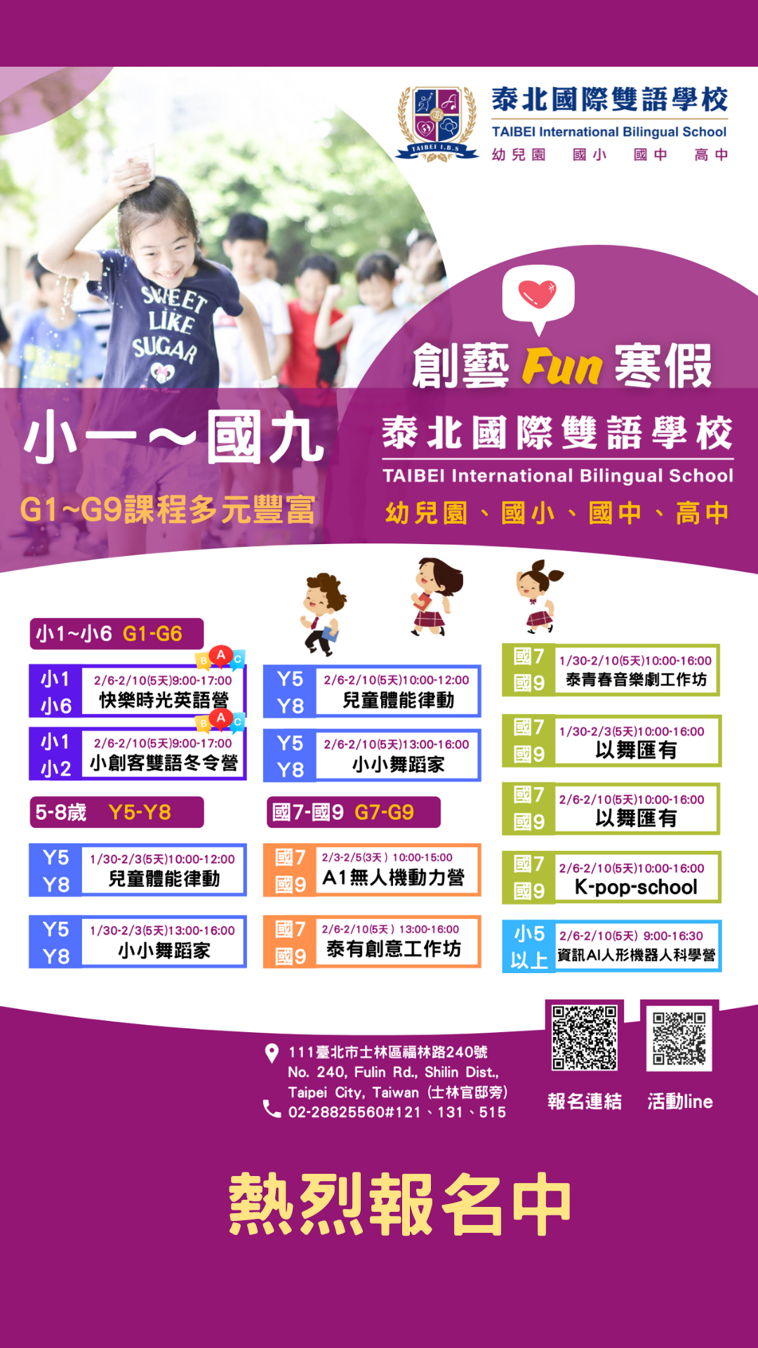 一、為了讓國小五六年級的學生與家長更能了解本校國中部的 辦學內容,於111年12月17日起至112年3月25日(星期六)止,辦理新生體驗營暨家長說明會。說明會報名方式可至 本校招生專網預約報名 ( https://reurl.cc/Rb9gpe )或撥 打招生專線電話報名( 02-28830972;28825560分機 215、 121)。