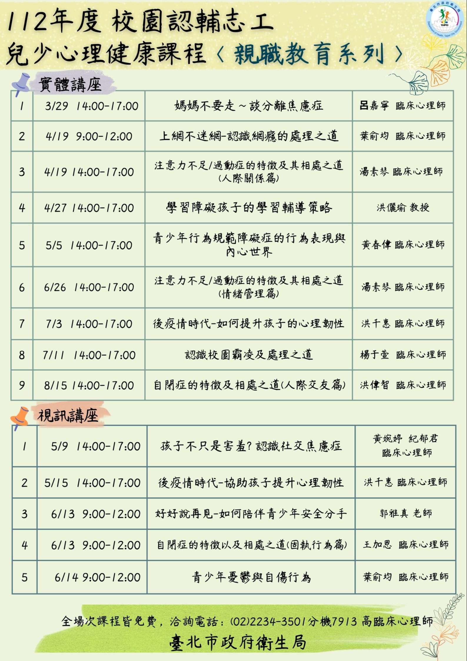 (四)報名網址:https://mental-health.gov.taipei/ (臺北市社區心理衛生中心官網-報名專區-講座/活動)。