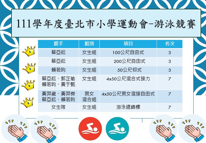 感謝游泳隊鄭叡澤教練、林育正教練、李佳旻教練、黃琇冠教練、林宥辰教練平時的訓練指導以及體育科李永祥老師協助帶隊參賽及機動支援賽事!