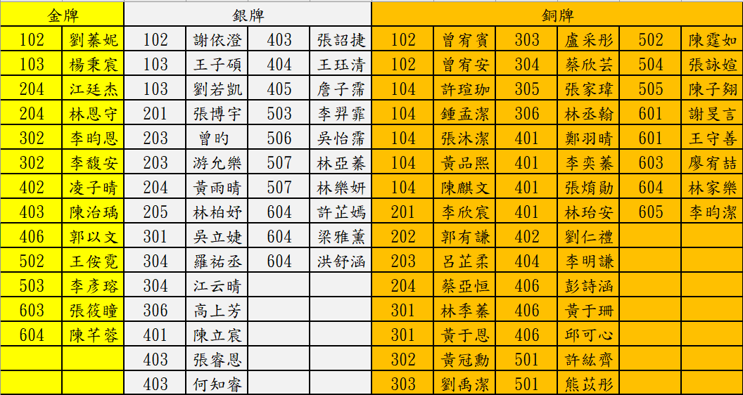 恭喜以下獲獎同學,獎狀預計於本學期初兒童朝會進行頒發。