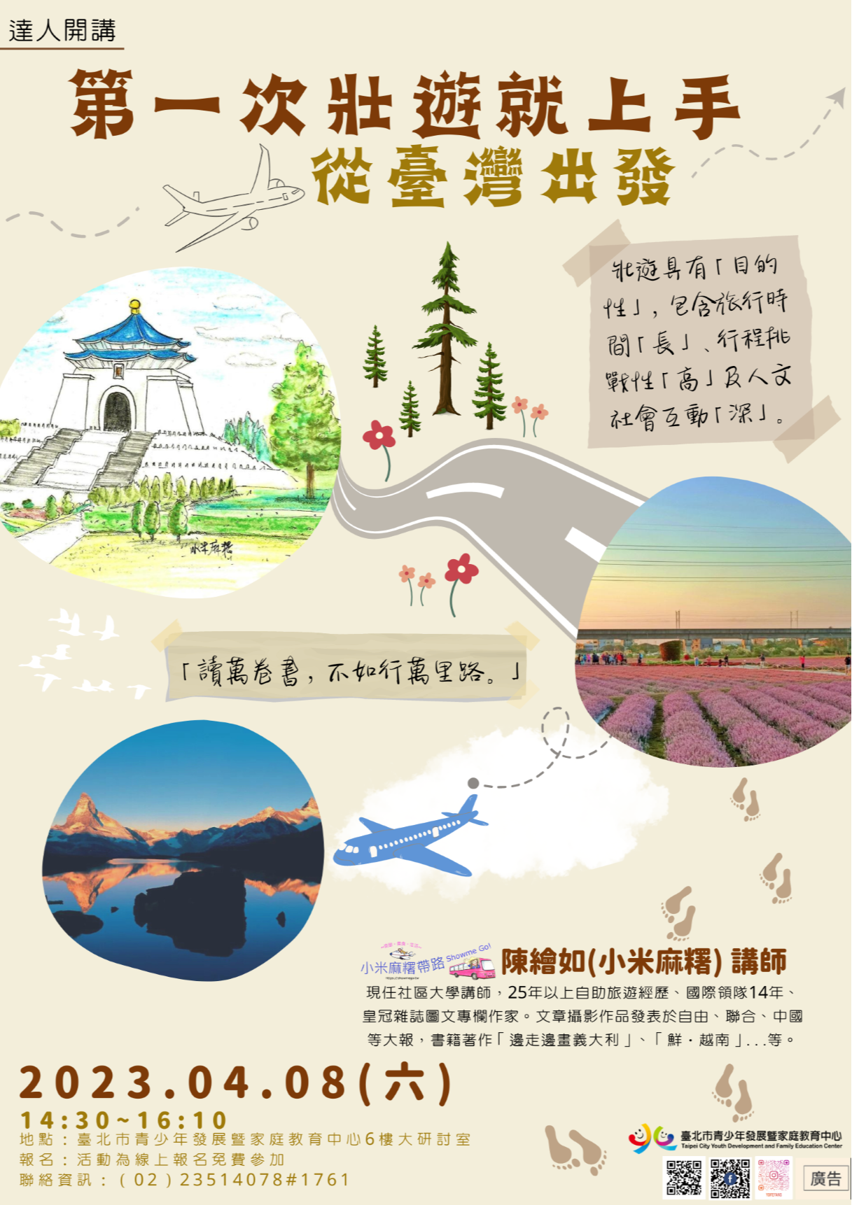 臺北市青少年發展暨家庭教育中心4月8日14:30舉辦達人開講:第一次壯遊就上手 從臺灣出發。陳繪如與您分享壯遊的意義,以及過程中的挑戰;活動免費詳見 青發家教中心官網