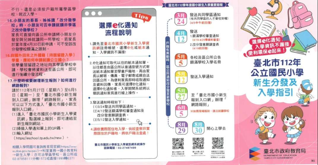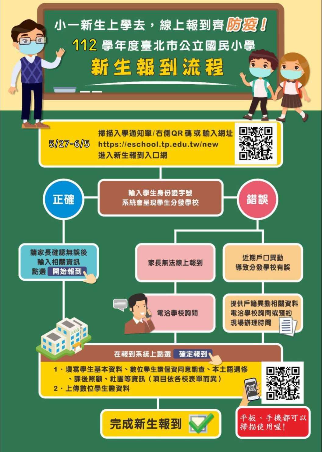 一、恭喜您的小朋友即將進入國民小學就讀,本年度新生報到程序將全面採 取電子化線上報到,無須到校辦理。您只需要在新生報到期間(112年5月27日上午9點起至6月5日下午5 點止)掃描入學通知單上的QR碼,或上網址: https://eschool.tp.edu.tw/new/363605,輸入學生身分證字號等資訊後,即可進行線上報到及學生資料填寫(請記得填完資料後,最後務必按下提交鍵)。【強烈建議使用桌機或平板進行線上報到】