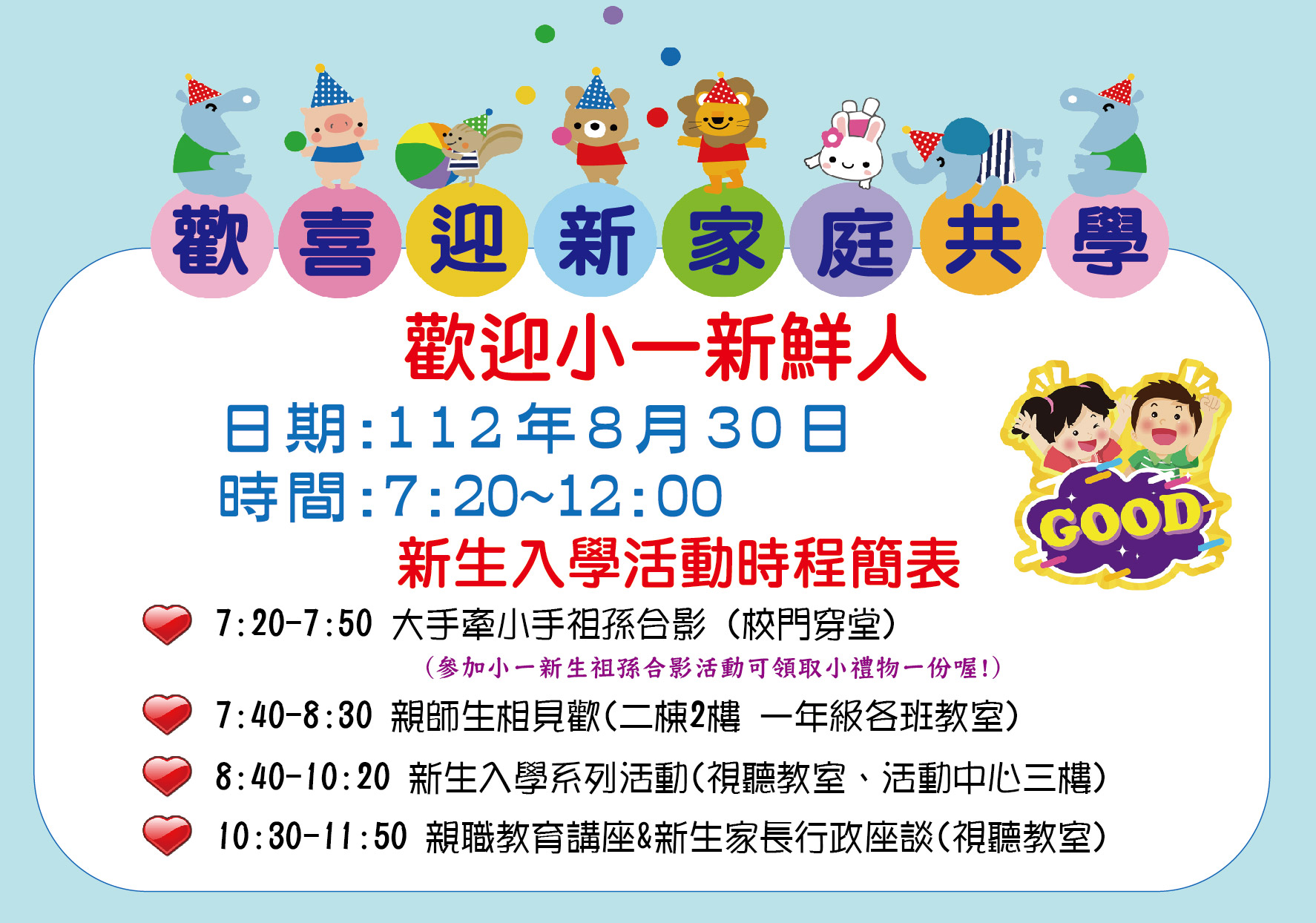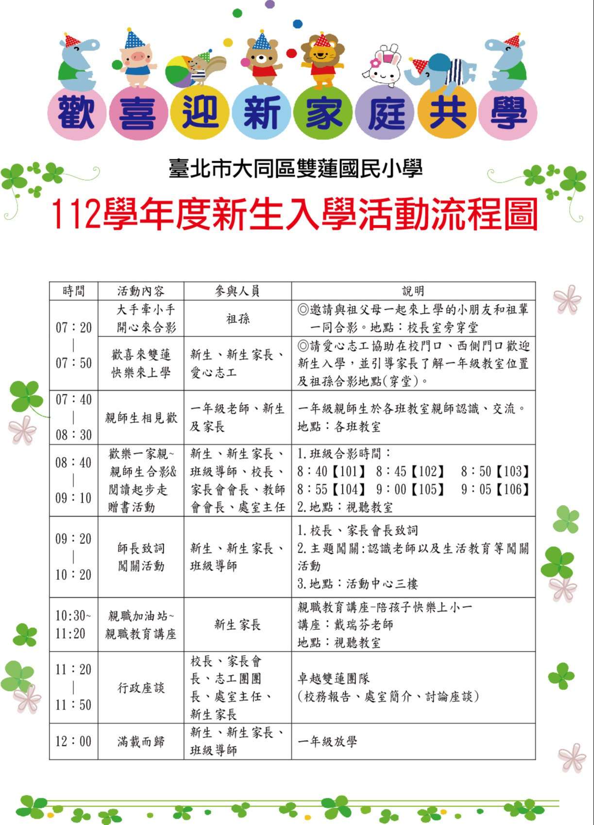 歡迎小一新生及家長加入雙蓮大家庭!開學日歡迎親子、祖孫一同來參加趣味闖關!