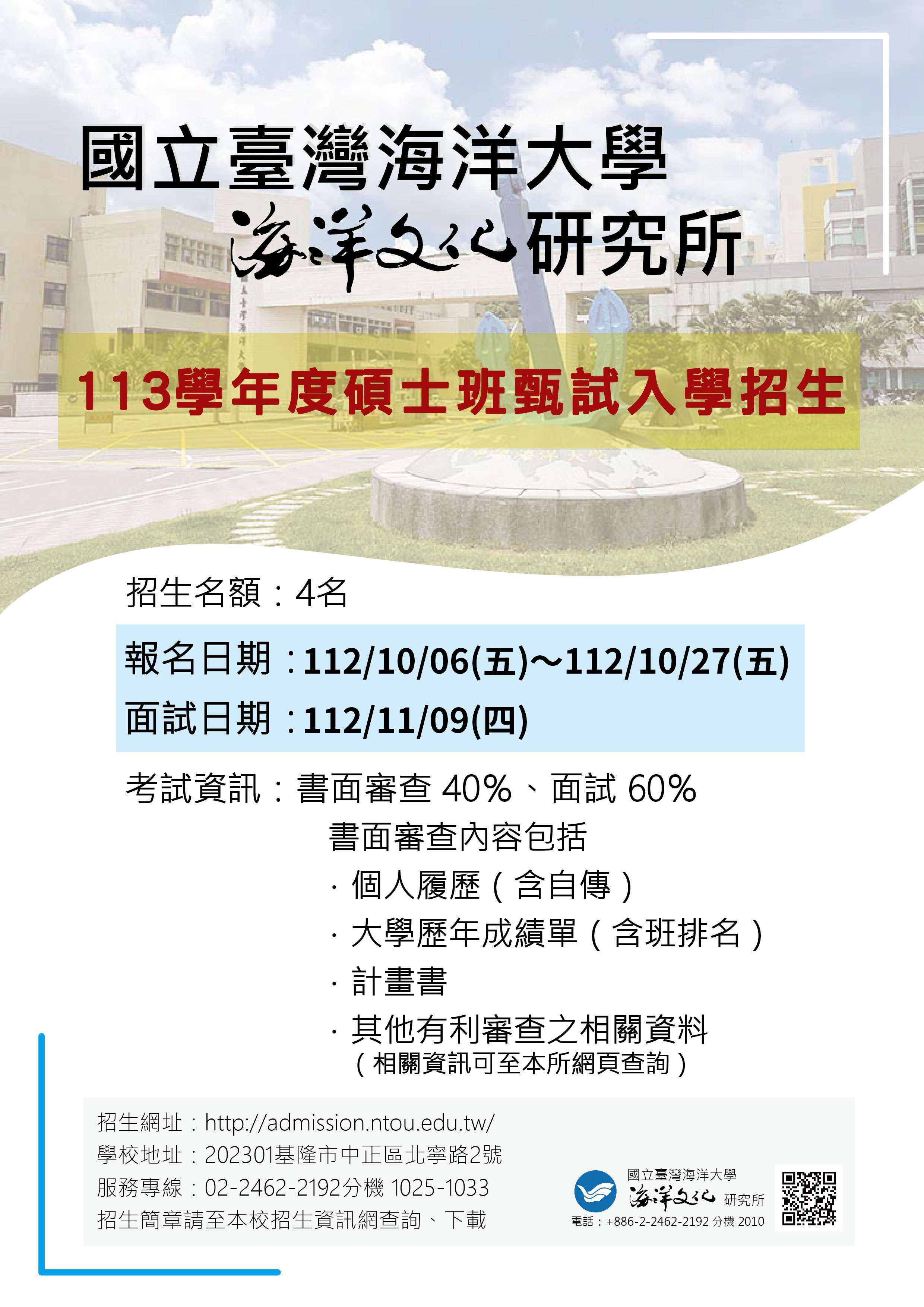 國立臺灣海洋大學海洋文化研究所113學年度碩士班甄試入學招生考試相關資訊如下: