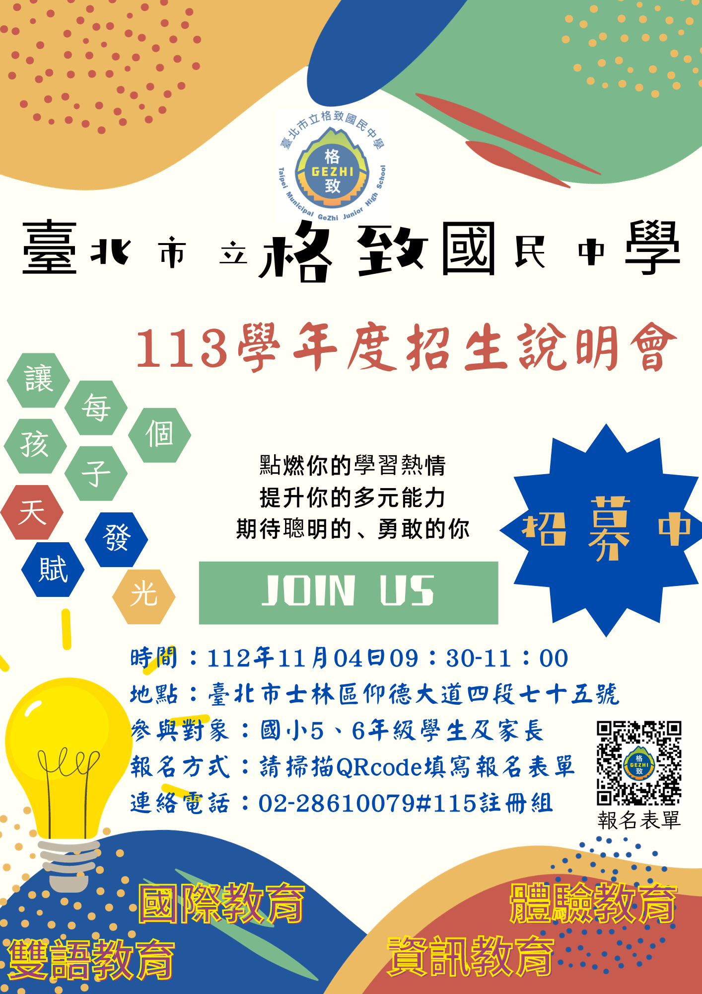 一、本校為臺北市第一所公立雙語實驗課程國中,以全人發展 的教育理念為核心,以雙語教育、國際教育、體驗教育及 資訊教育為四大辦學主軸。近年來研發並實施雙語課程及 陽明山校本課程,期望能提升學生學習表現,讓孩子天賦 自由,培養其潛能,塑造美善人格,創造亮麗的未來人 生。