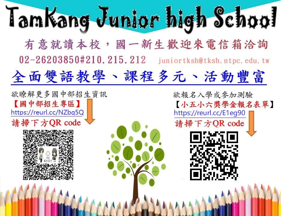 一、新北市私立淡江高級中學附設國中部訂於113年 3月 2日(星期六)上午舉辦小五小六獎學金 測驗暨家長說明會,歡迎小五、小六學生及家長報名參加。