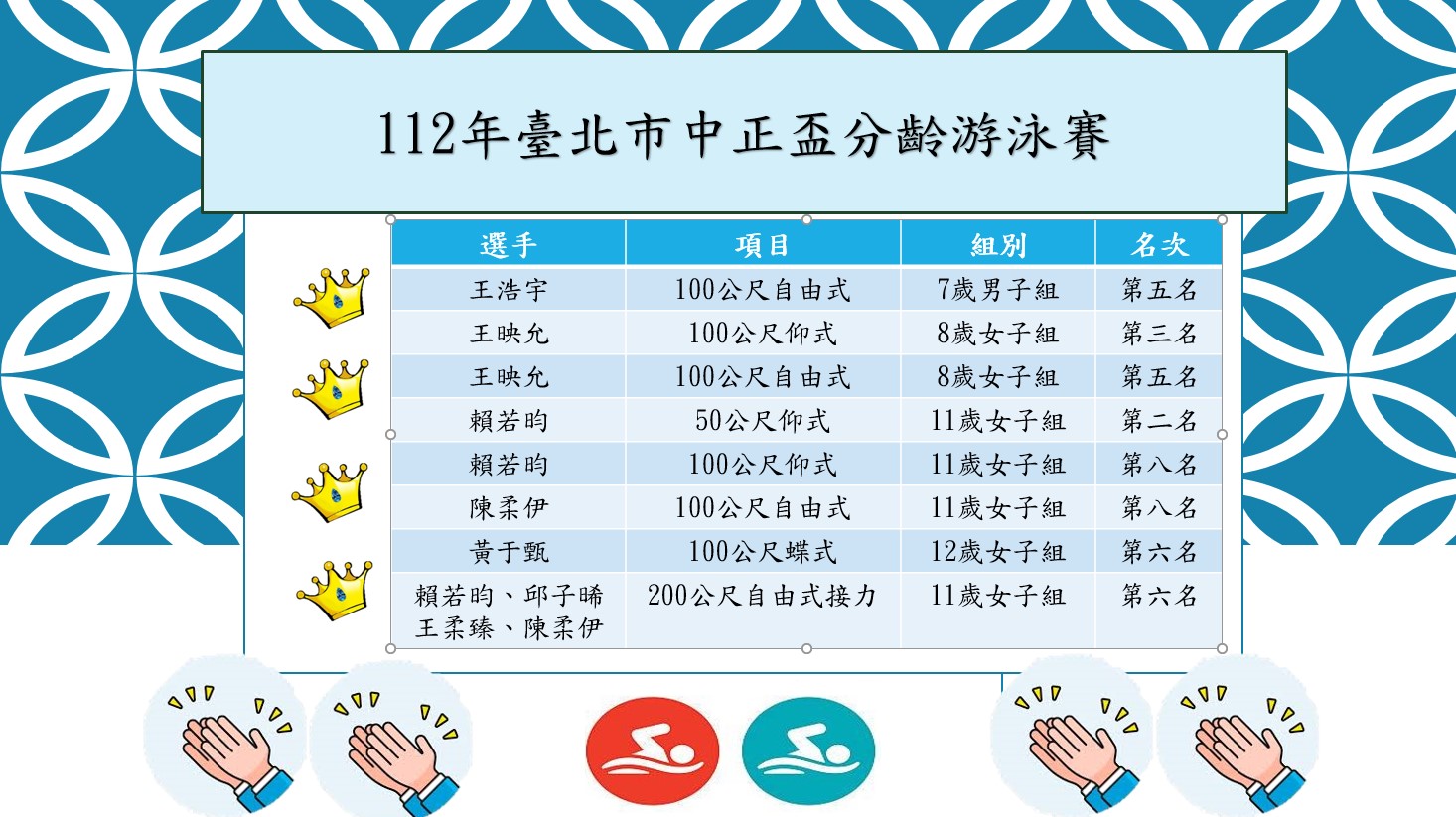 感謝泳隊高子惟教練、李佳旻教練、李怡潔教練辛苦的指導,以及當天到場協助的家長們.