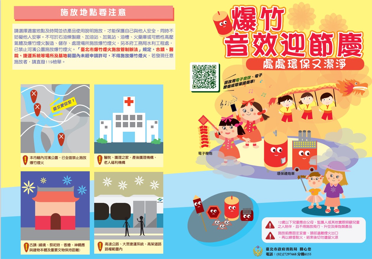 (一)禁止於加油站、瓦斯行、高速公路、大眾捷運系統、高 架道路、古蹟、醫院、護理之家、產後護理機構及老人 福利機構等場所及基地範圍內施放爆竹煙火;另本府工 務局水利工程處已禁止本市河濱公園施放爆竹煙火。
