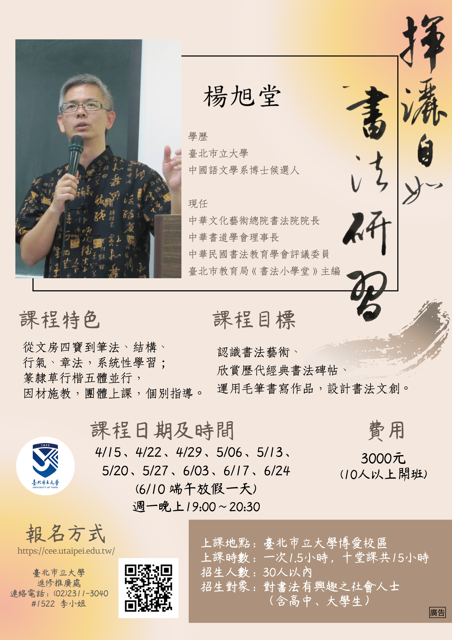 三、師資:楊旭堂老師(中華文化藝術總院書法院院長/中華書 道學會理事長/臺北市教育局《書法小學堂》主編)。
