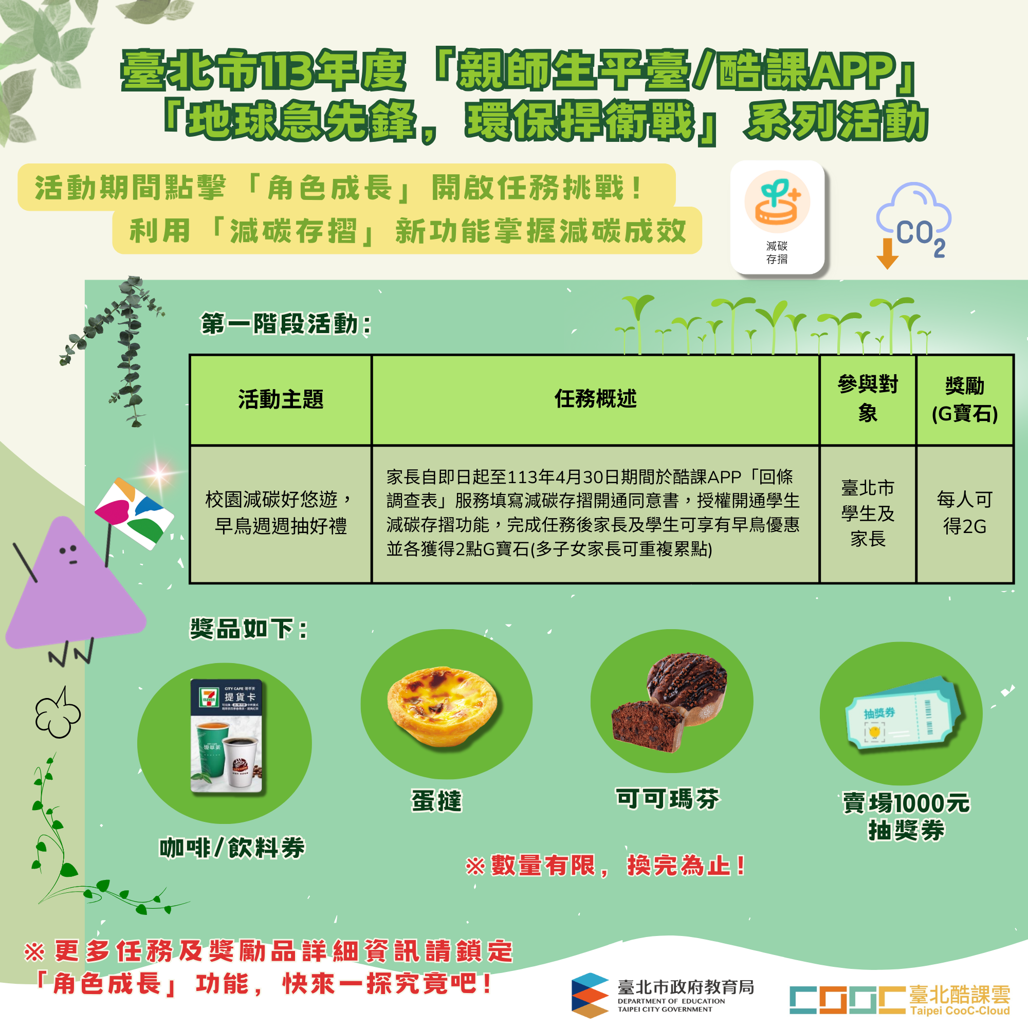 一、為響應2025淨零碳排目標,培養學生環境保育觀念,113年4月於「親師生平臺/酷課APP」推出學生「減碳存摺」功能,並結合酷課APP「角色成長」獎勵制度,推出「地球急先鋒,環保捍衛戰」系列活動計畫(附件1)。
