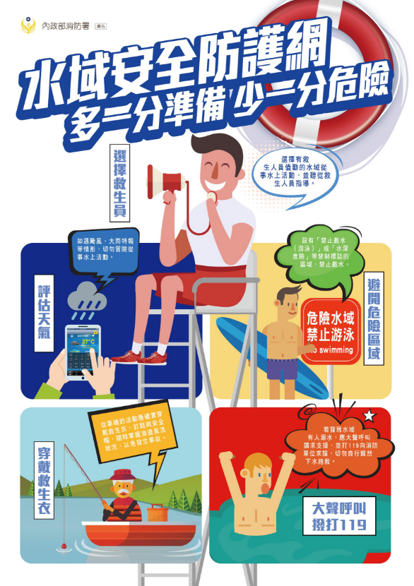 從事水域活動應選合法水域,戲水前注意天氣並做好暖身,以確保安全。
