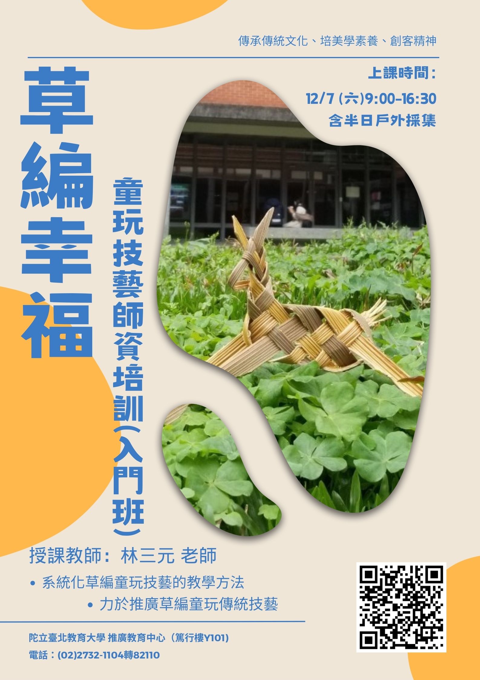 一、草編幸福-童玩技藝師資培訓(入門班):113年12月7日(六) 9:00-16:30共6小時,全勤並通過評核將核發研習證明書。 課程特聘專業草編達人「草編CEO林三元老師」親授,包含 戶外採集、戶外與教室型態的教學示範、草編文化歷史理論介紹,豐富多樣的內容不藏私分享,歡迎18歲以上對草編童玩有興趣之教師或一般民眾報名。
