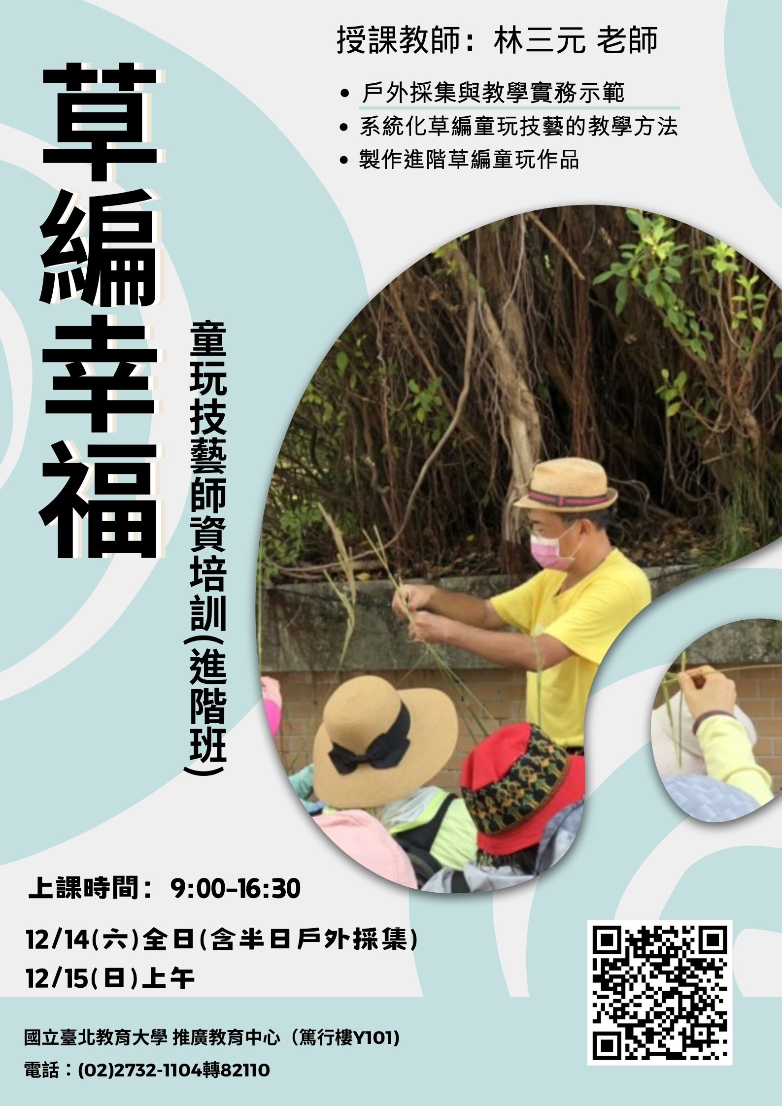 二、草編幸福-童玩技藝師資培訓(進階班):113年12月14日 (六)及12月15日(日)共9小時,全勤並通過評核將核發研習證明書。課程特聘專業草編達人「草編CEO林三元老師」親授,包含戶外採集、戶外與教室型態的教學示範、教學計劃撰寫、教學經驗分享等,歡迎18歲以上對草編童玩有興趣之教師或一般民眾報名。