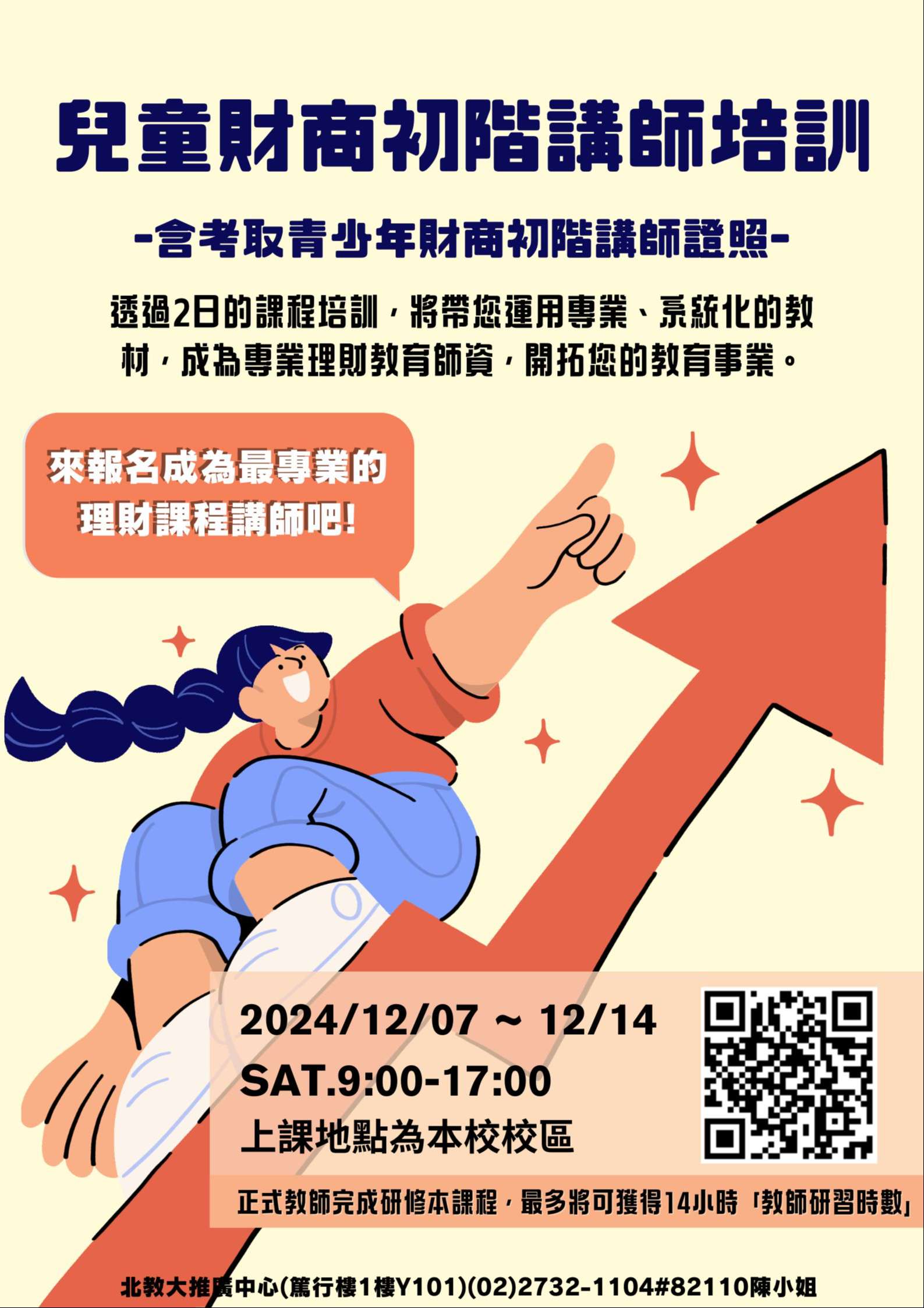 三、兒童財商初階講師培訓班:113年12月7日、12月14日週六 9:00-17:00共14小時,現場考取「青少年財商初階講師證照」。在學之大學生或研究生、教育及培訓機構教師、對 「兒童財商教育」有興趣之社會人士皆可報名。
