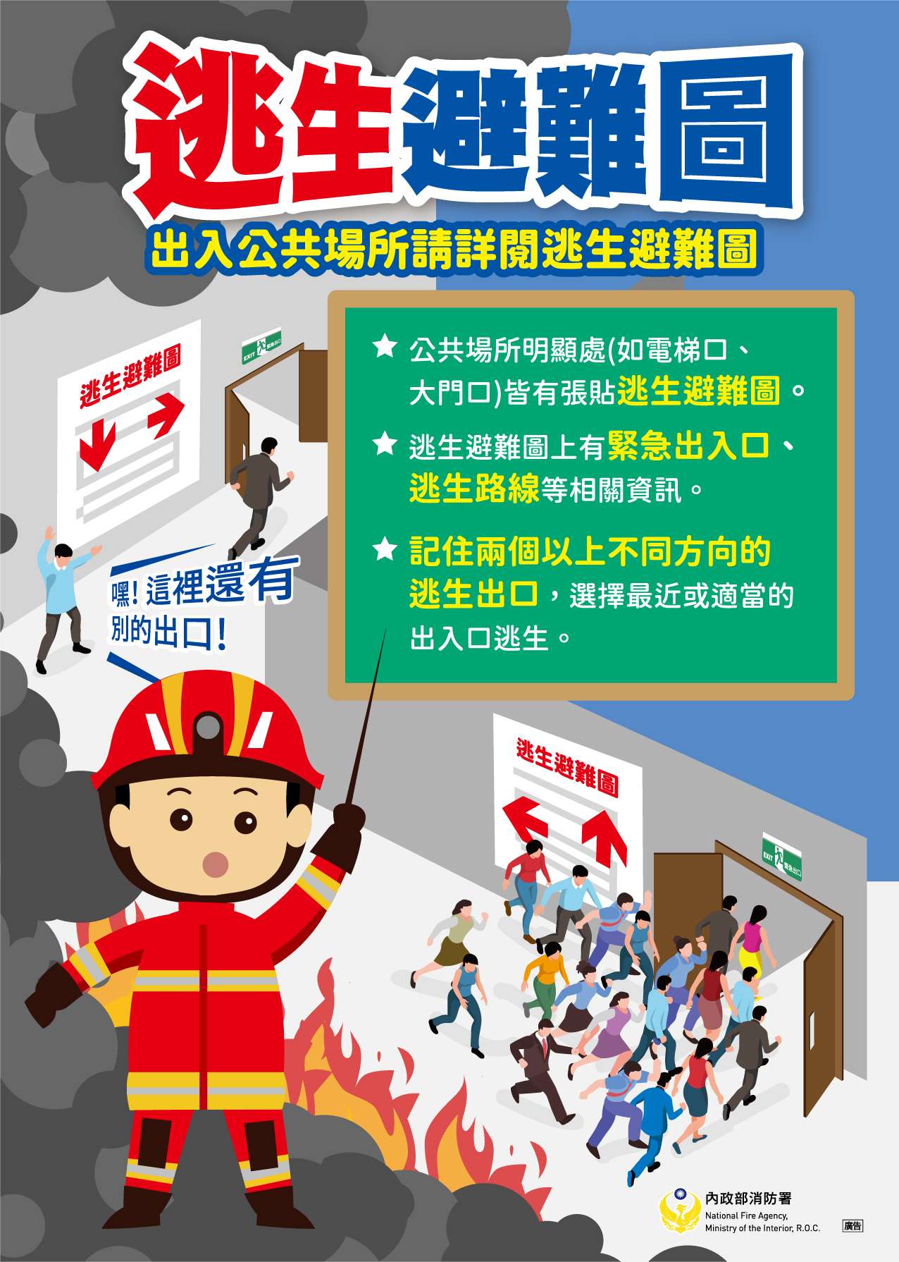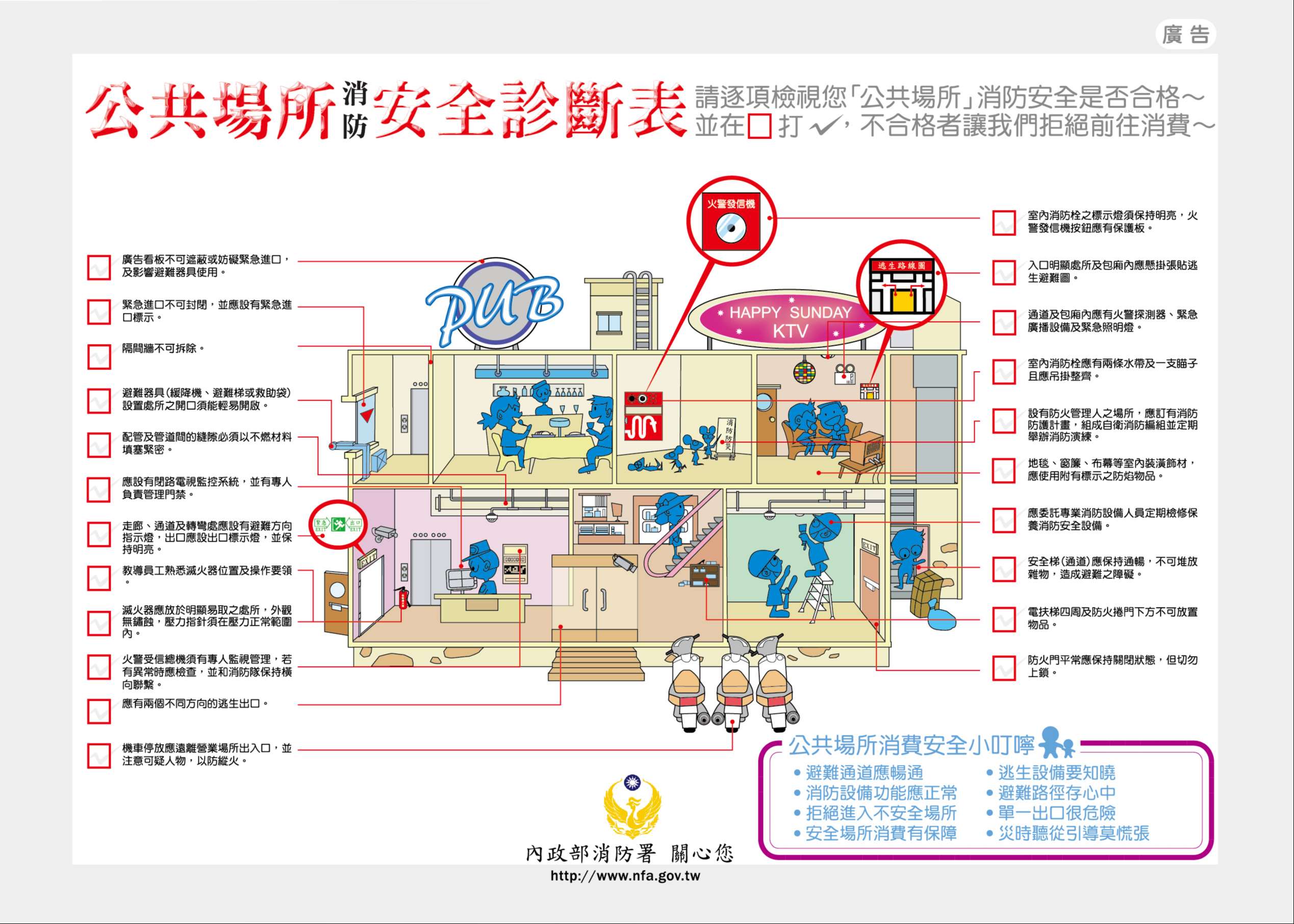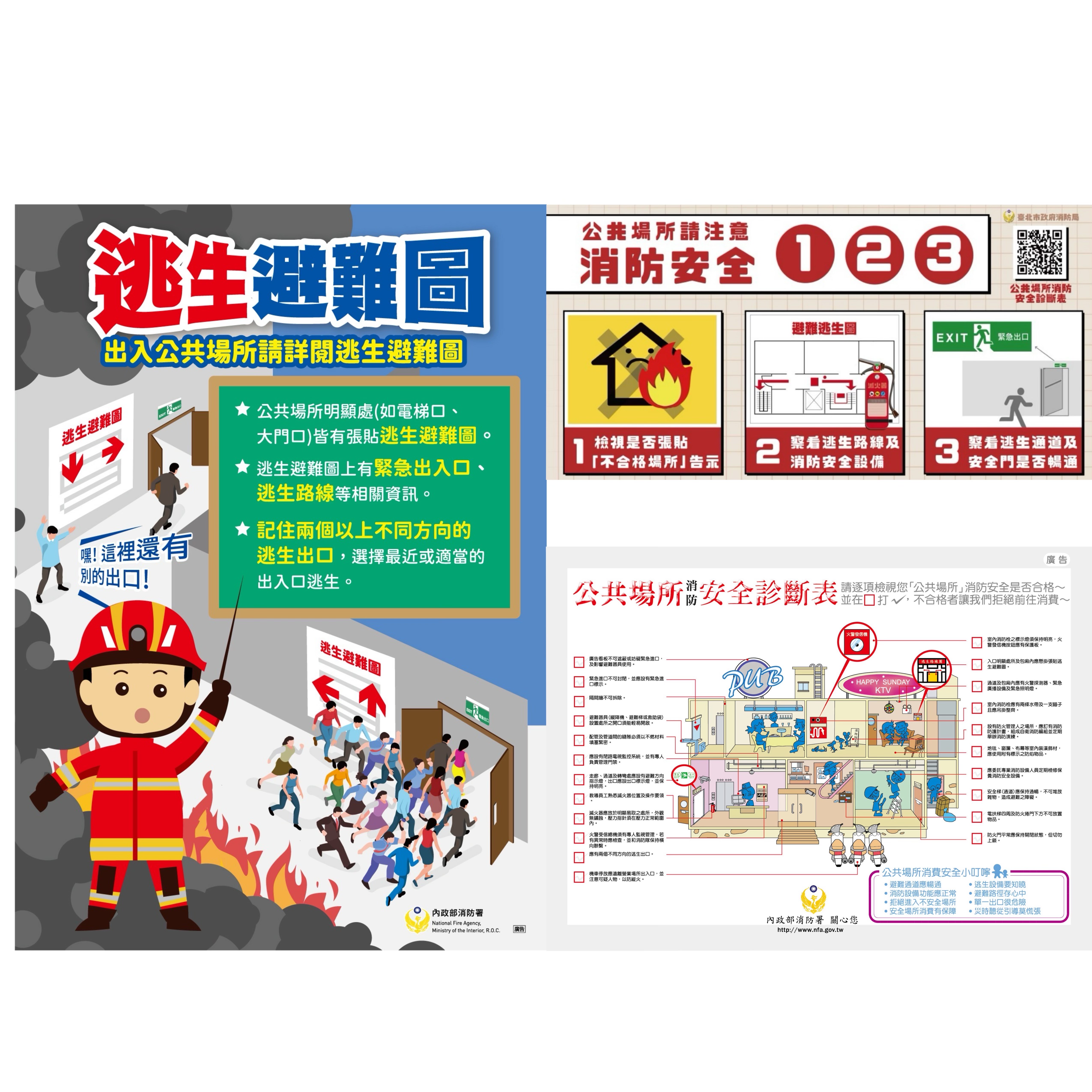 民眾進入公共場所時,應檢視是否張貼「不合格場所」告示, 留意滅火器、室內消防栓等消防安全設備位置,並確認逃生路 線,注意樓梯、走廊、通道及出口等路徑是否暢通無阻,以利 火災應變及避難逃生使用。