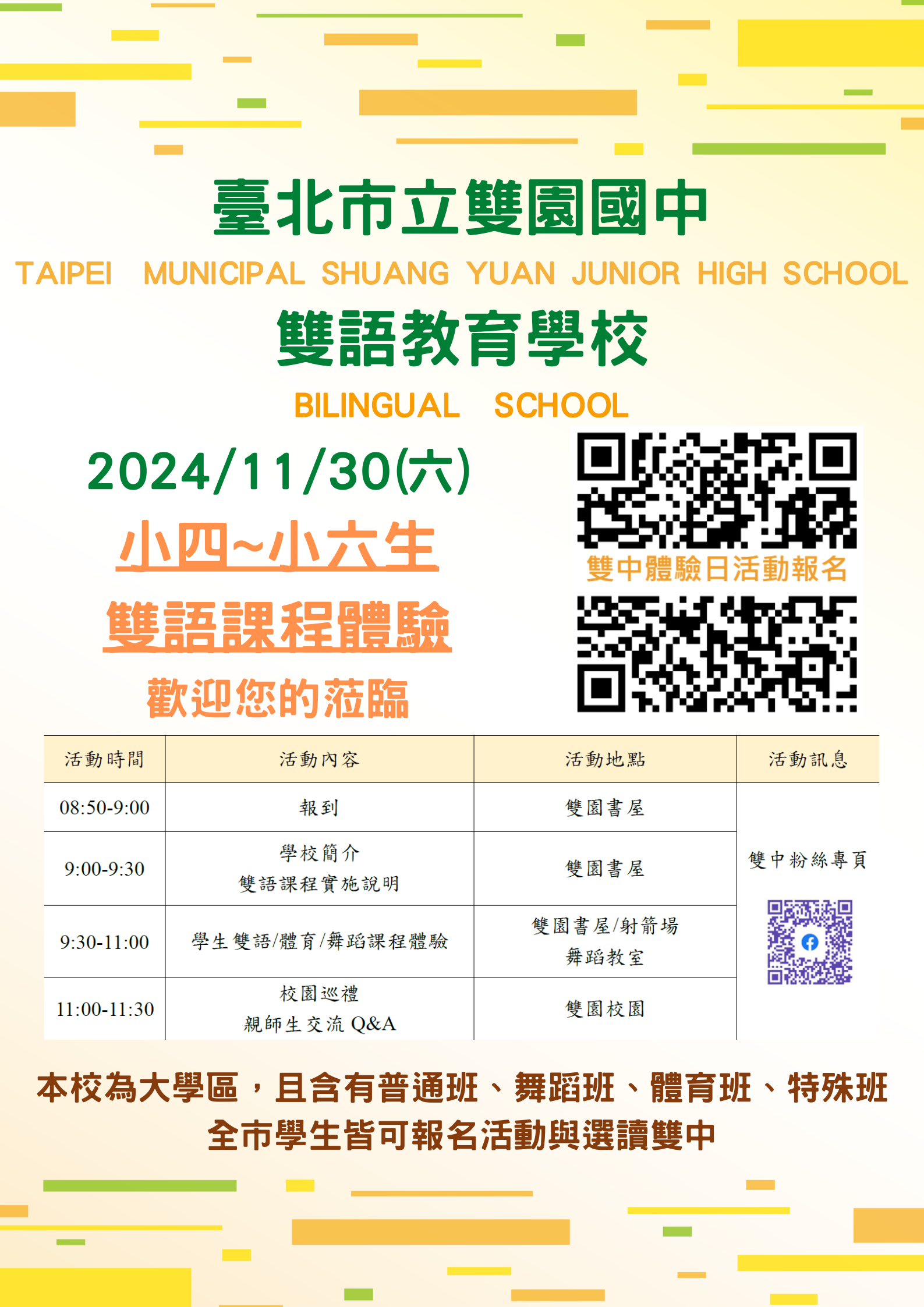 一、臺北市立雙園國中(以下簡稱本校)為雙語學校,並設有普通班、體育班及舞蹈班,期透過本校辦學理念說明、學校簡介及課程體驗等活動,增進國小學生及家長對本校的瞭解與認識。