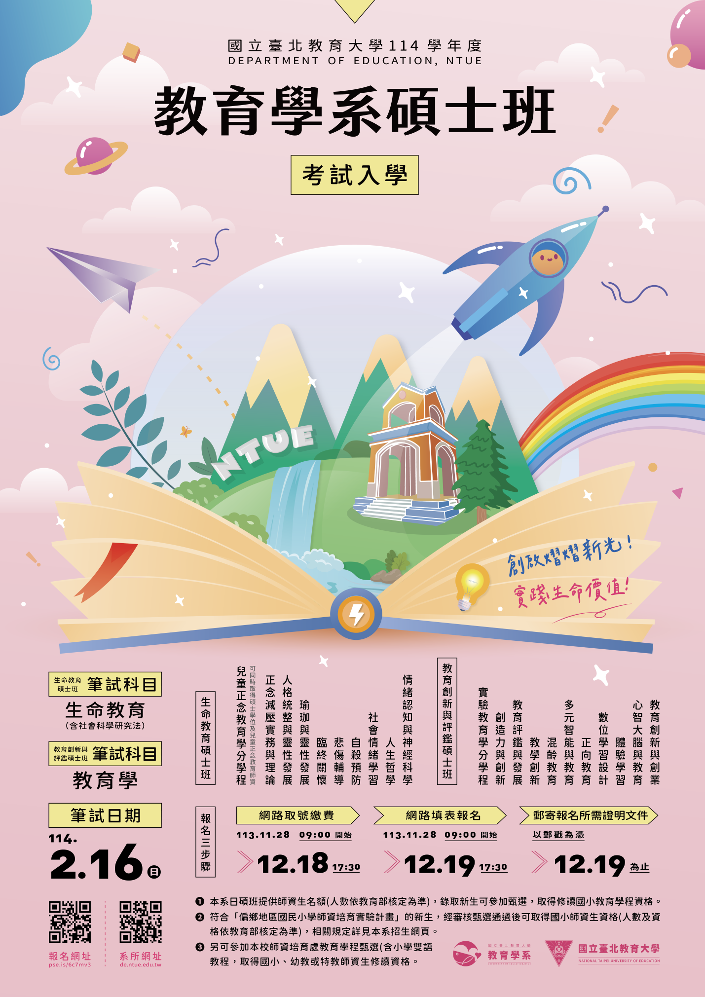 五、詳細招生資訊請參閱本校教育學系網站 https://de.ntue.edu.tw 及招生系統 https://exam.ntue.edu.tw/ 。 六、檢附教育學系114學年度考試入學招生海報乙份。