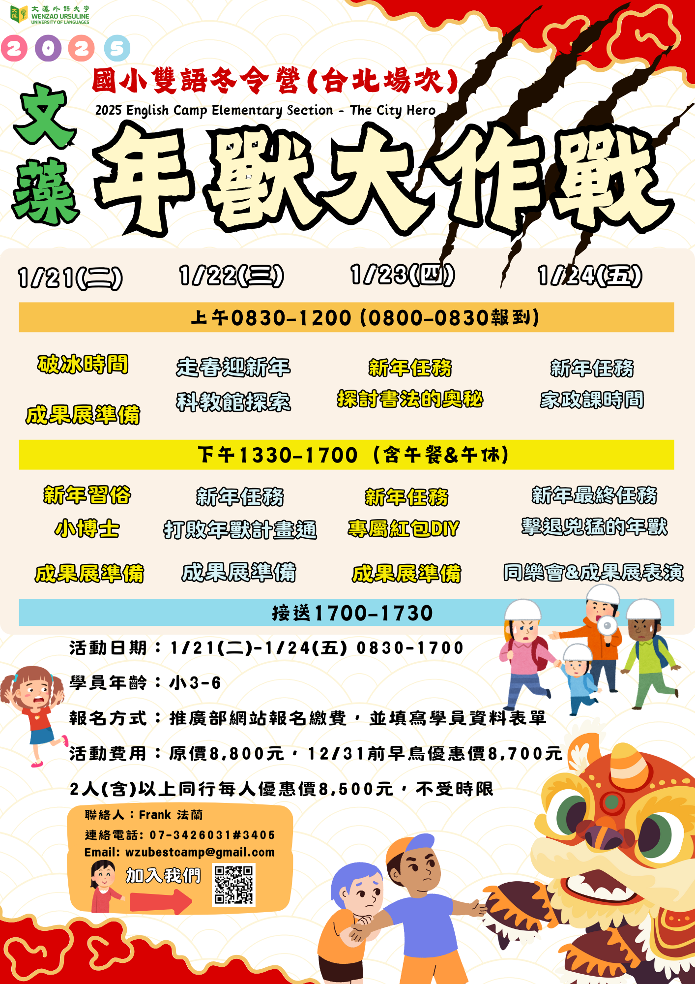 (一)「年獸大作戰」:民國114年1月21日(星期二)至114年1月24日(星期五),上午8時至下午5時。