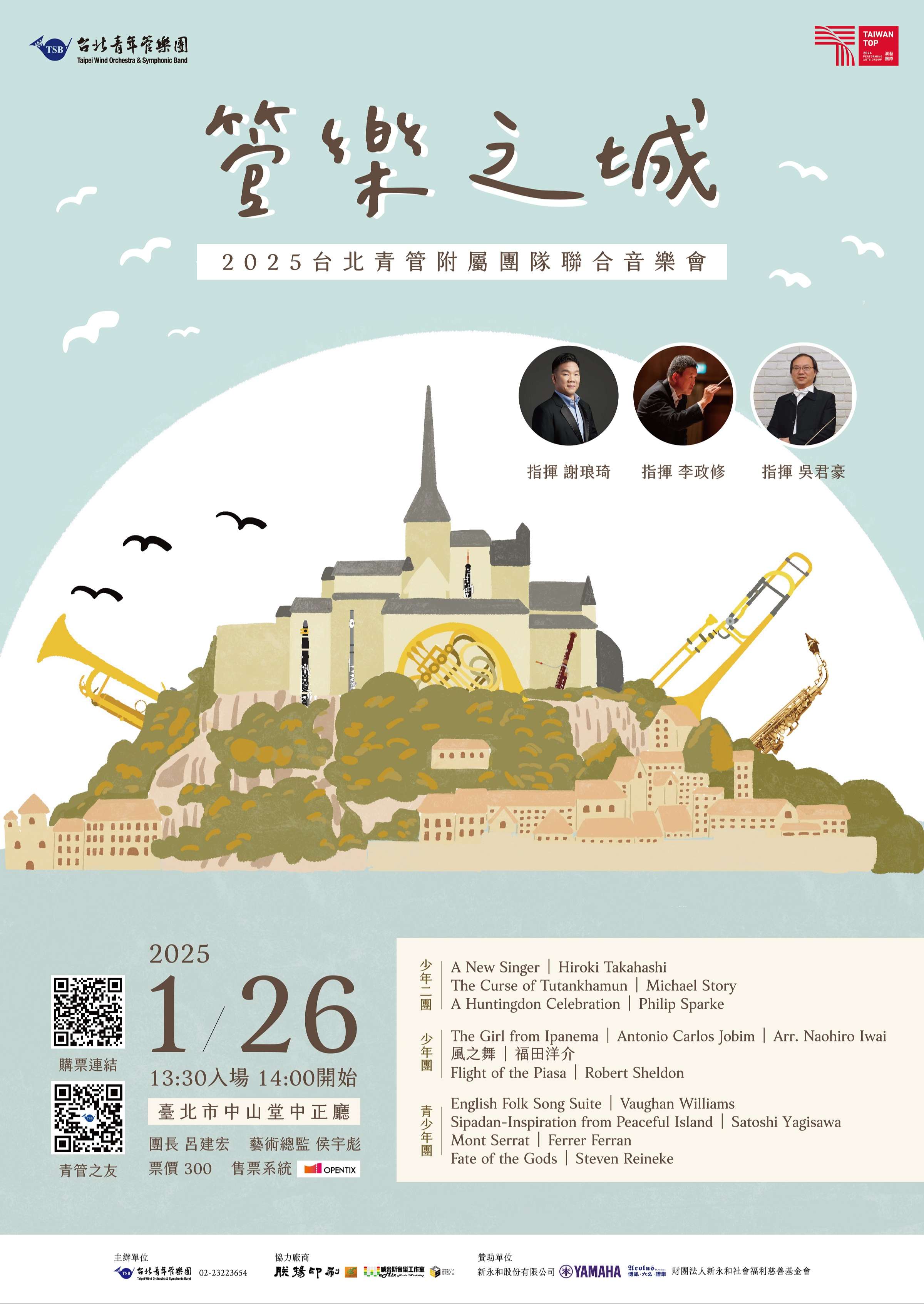 一、2025台北青管附屬團隊聯合音樂會,由謝琅琦、李政修與 吳君豪3位老師,指揮台北青管附屬團隊演出,帶來一連串 耳熟能詳的管樂經典曲目。