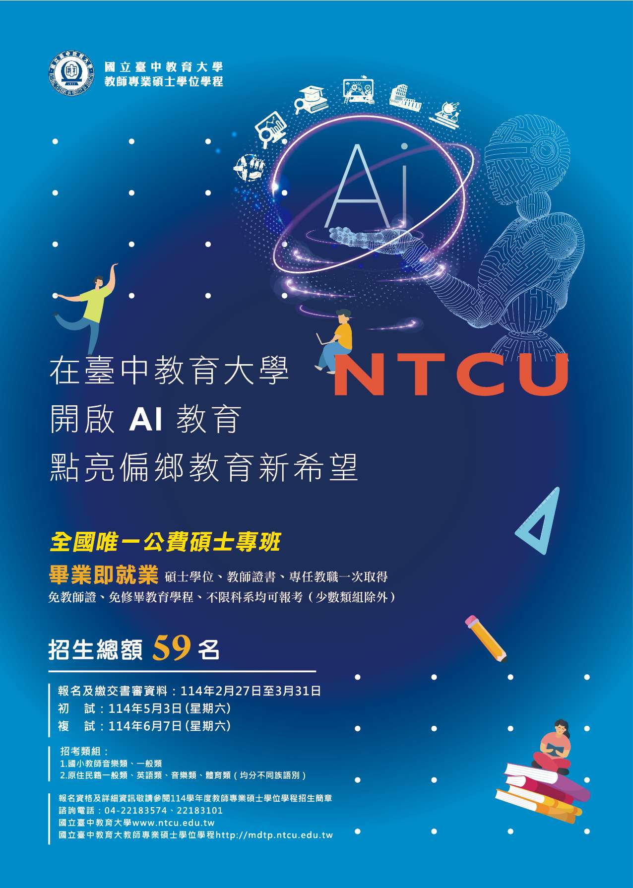 一、本校教師專業碩士學位學程為碩士公費師資專班,教師證 書、專任教職、碩士學位一次取得,歡迎有志投入偏鄉教 育志業的學子及代理代課教師報考。