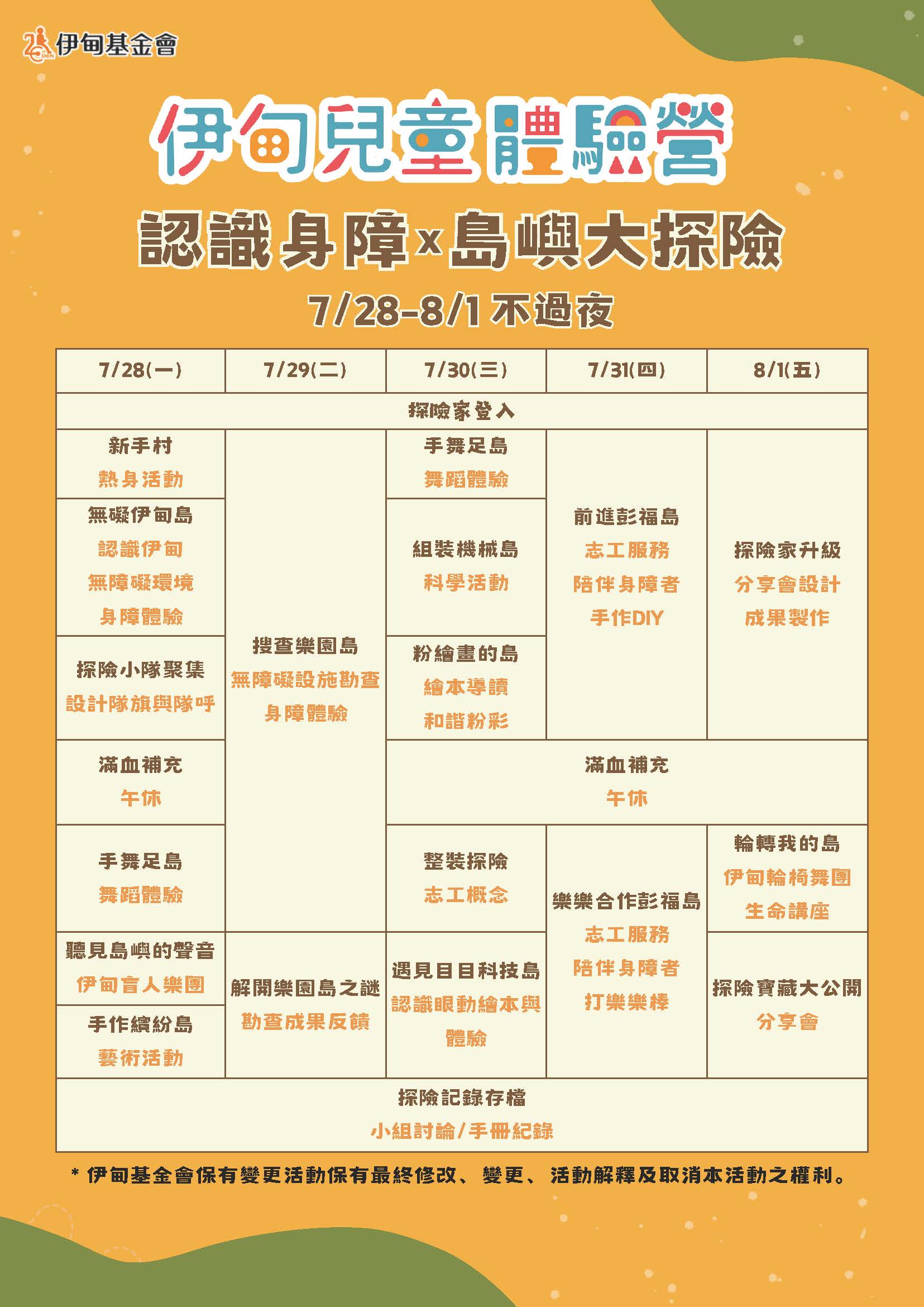 財團法人伊甸社會福利基金會於114年7月28日至8月1日,辦理「2025伊甸兒童體驗 營-認識身障x島嶼探險」的營隊活動,期昐能邀請孩子一 起認識身心障礙,讓改變從體驗開始!