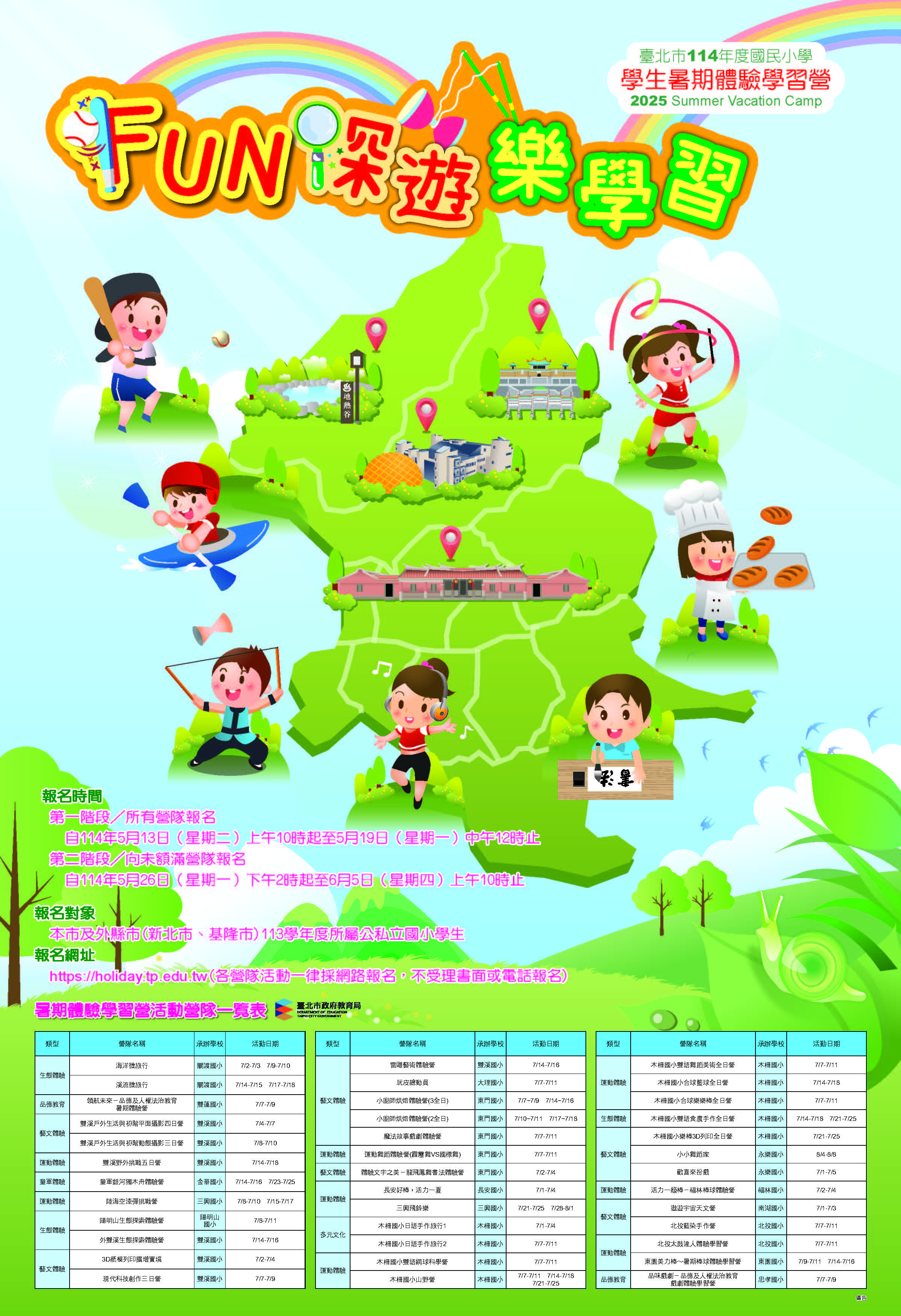 二、本案各營隊活動報名系統請詳參「臺北市國民小學暑期體驗營」報名系統,網址:https://holiday.tp.edu.tw。