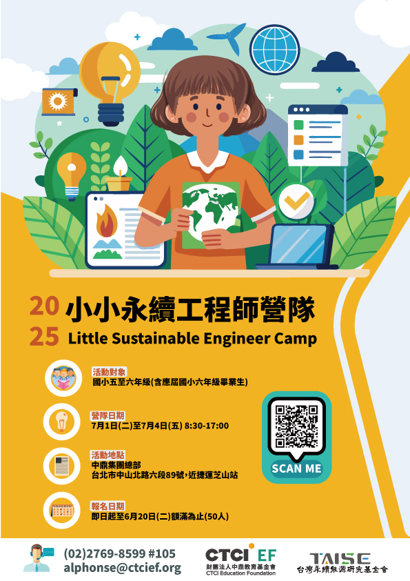 三、活動資訊摘要: 報名資訊:即日起至114年6月20日(五)止 (50人為限,額滿即止),僅接受網路報名,敬請進入活動 報名網頁 (https://reurl.cc/Z4vlEp) 報名資格:114學 年度國小五、六年級生(含應屆畢業生)。活動時間:2025年7月1日(二)至7月4日(五) (不過夜營隊)。 敬請持續關 注本會臉書粉絲專頁(https://www.facebook.com /CTCIEF/ ) 及官網掌握活動消息。 活動洽詢:中鼎教育 基金會 林經理,電話:(02)2769-8599 轉105。信箱: alphonse@ctcief.org。