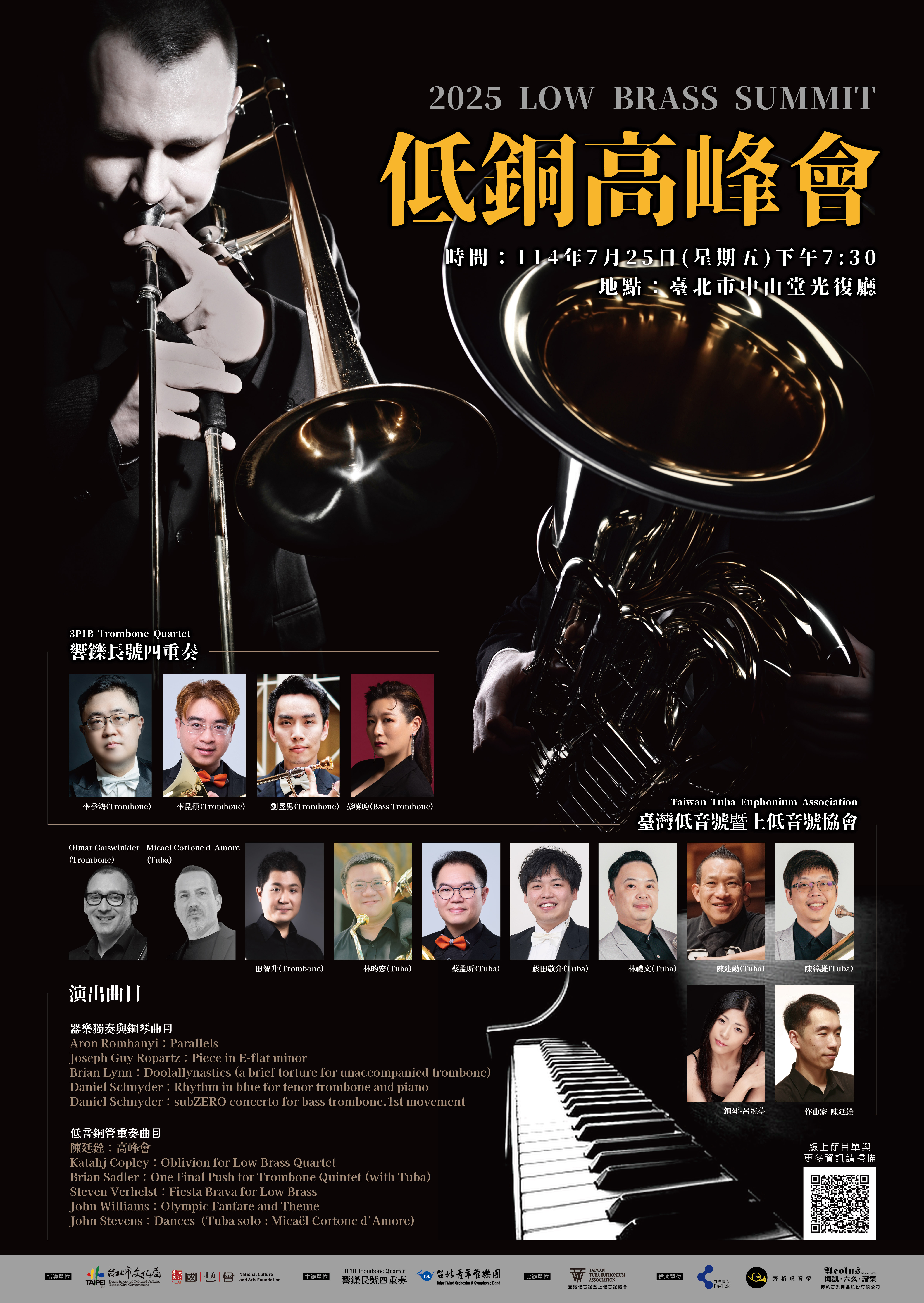 一、由臺灣職業樂團長號首席與國家交響樂團低音長號彭曉昀 老師組成的響鑠長號四重奏,將帶來一連串精彩萬分的長 號獨奏與重奏曲目。更邀請國內外低音號演奏名家一同參 與,是一場不可錯過,精彩萬分的低銅音樂饗宴