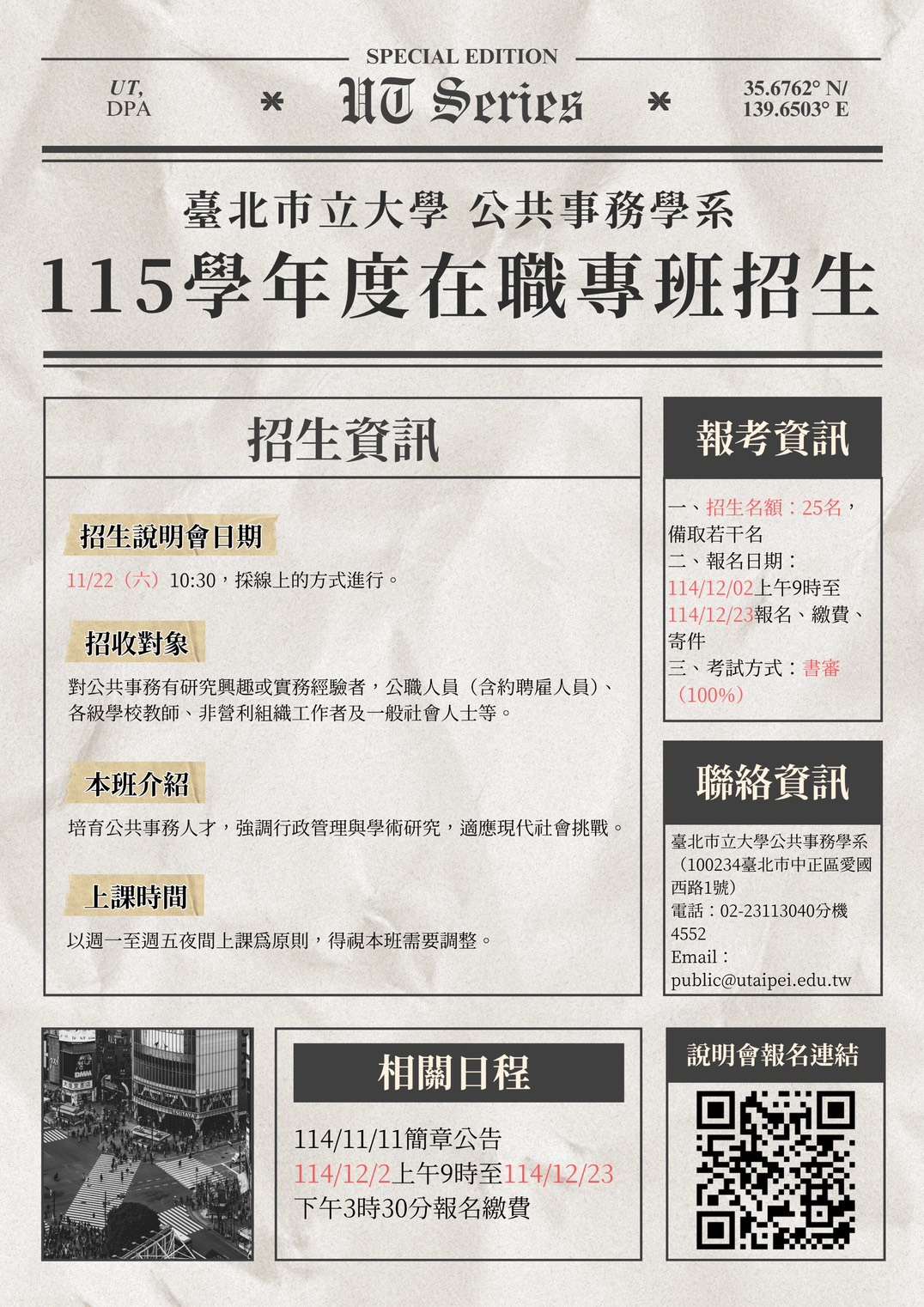 一、為培養公共事務人才,並鼓勵現職公務人員在職進修,充 實專業知能,本系特辦理 115 學年度在職專班招生。