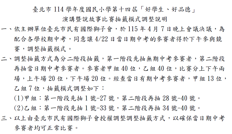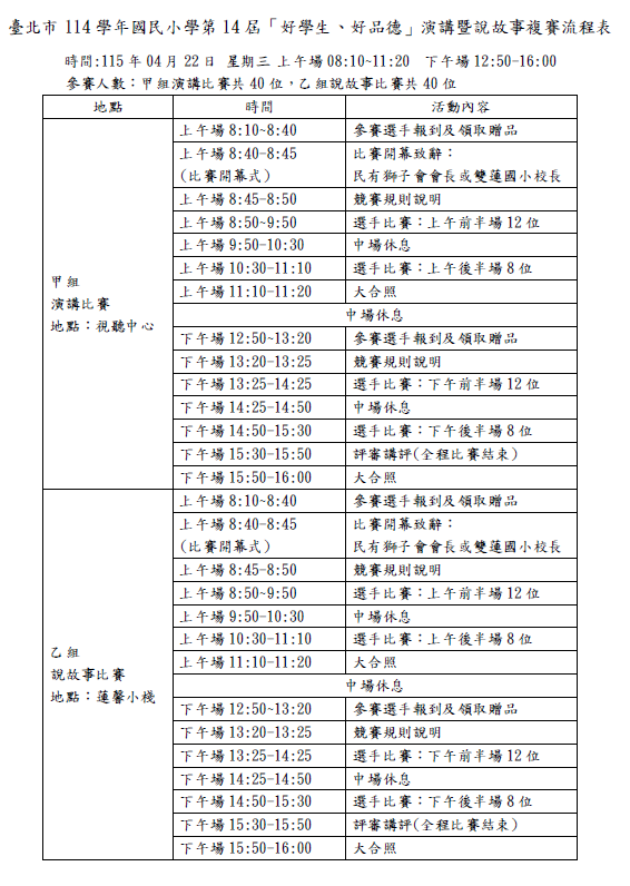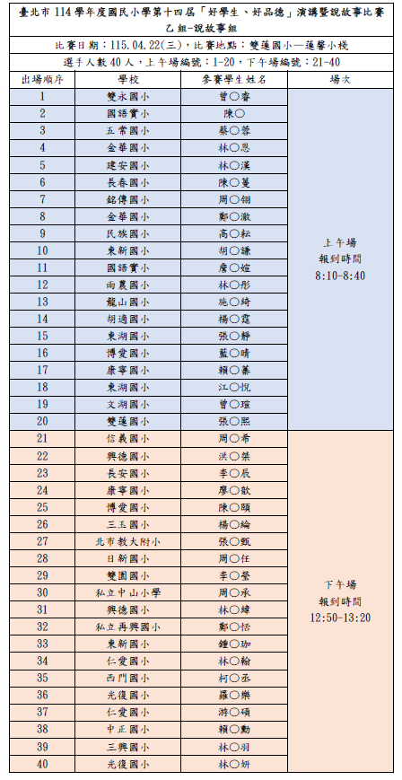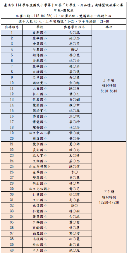 臺北市114學年度國民小學第十四屆「好學生、好品德」演講暨說故事比賽抽籤結果